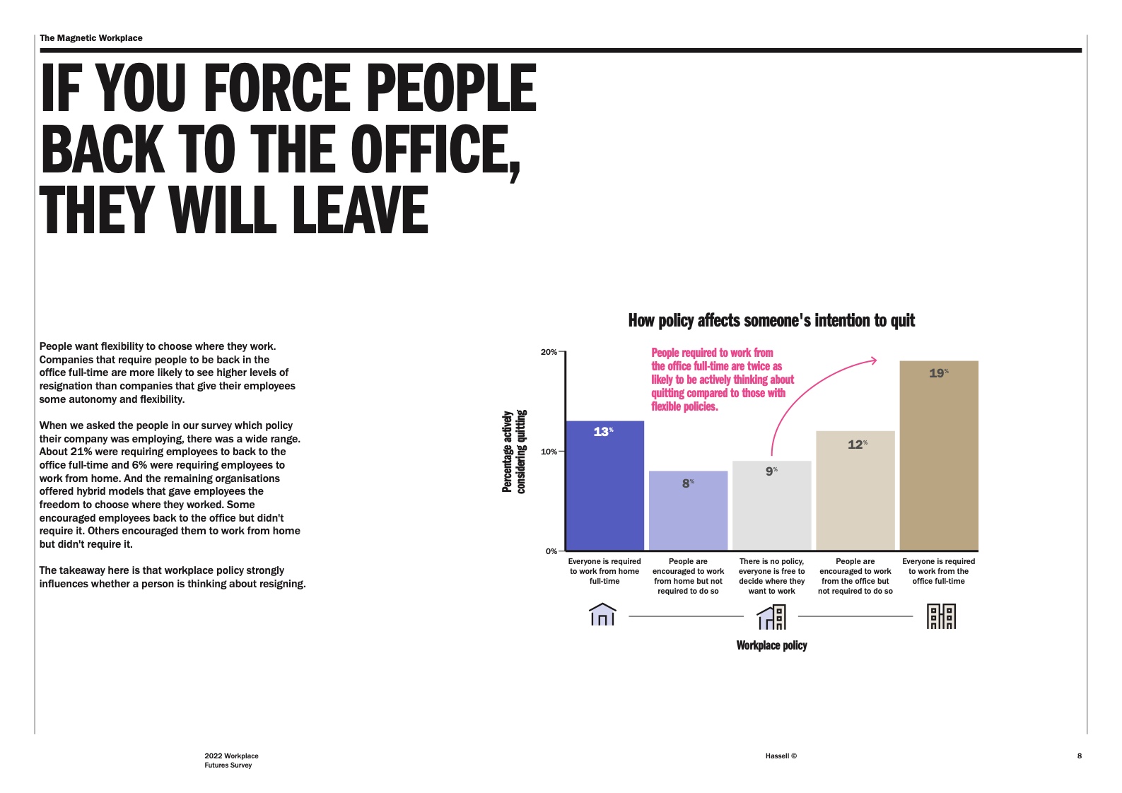 员工需要可以自行选择工作模式的自由。调研显示,相较于那些给与员工自主和灵活选择在哪里办公的公司来说,那些要求员工100%完全回办公室工作的公司,员工辞职率也更高。