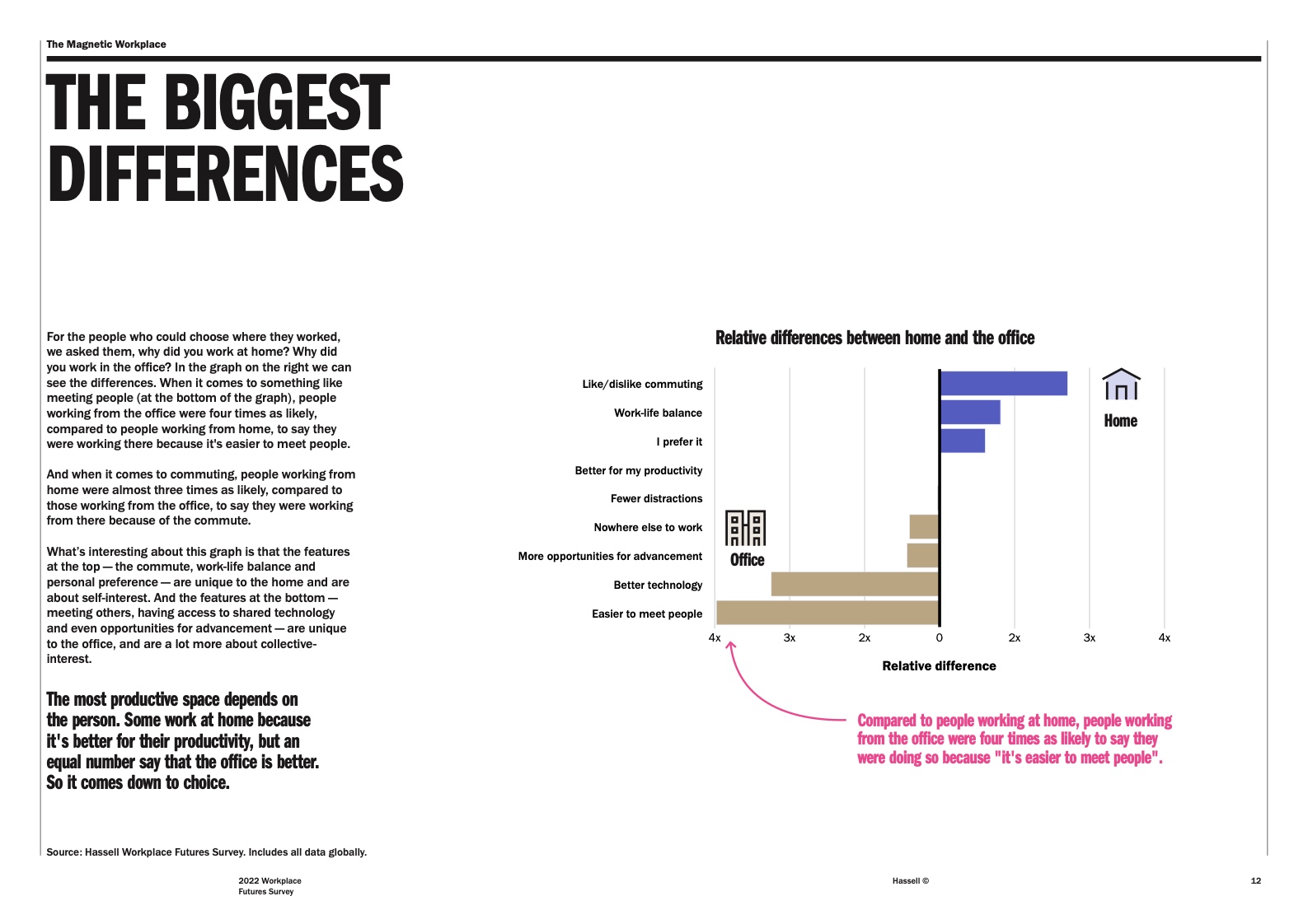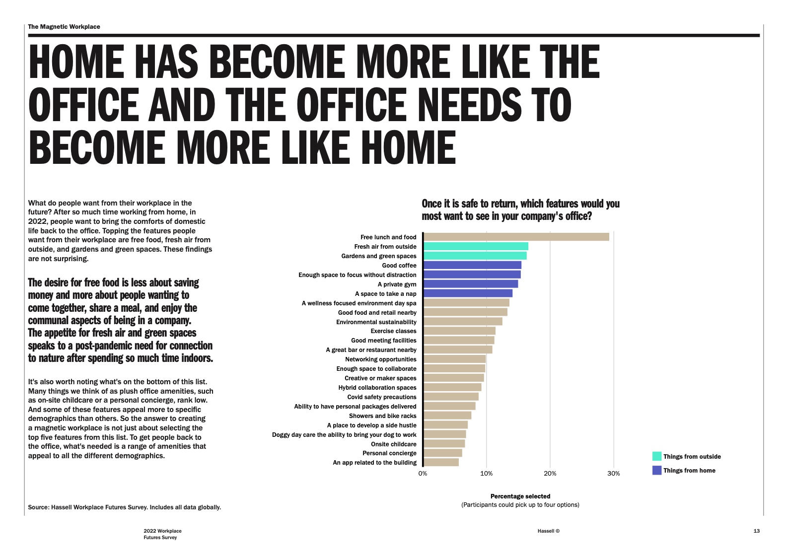家里越来越像办公室了,因此办公室也需要让人感觉像家一样。人们在家工作了相当长的一段时间,因此当他们重回办公室的时候会期待更多 —— 更新鲜的空气、花园和绿植空间、美味的咖啡和足够的专注空间免受打扰 —— 这些是他们在家轻松拥有的。