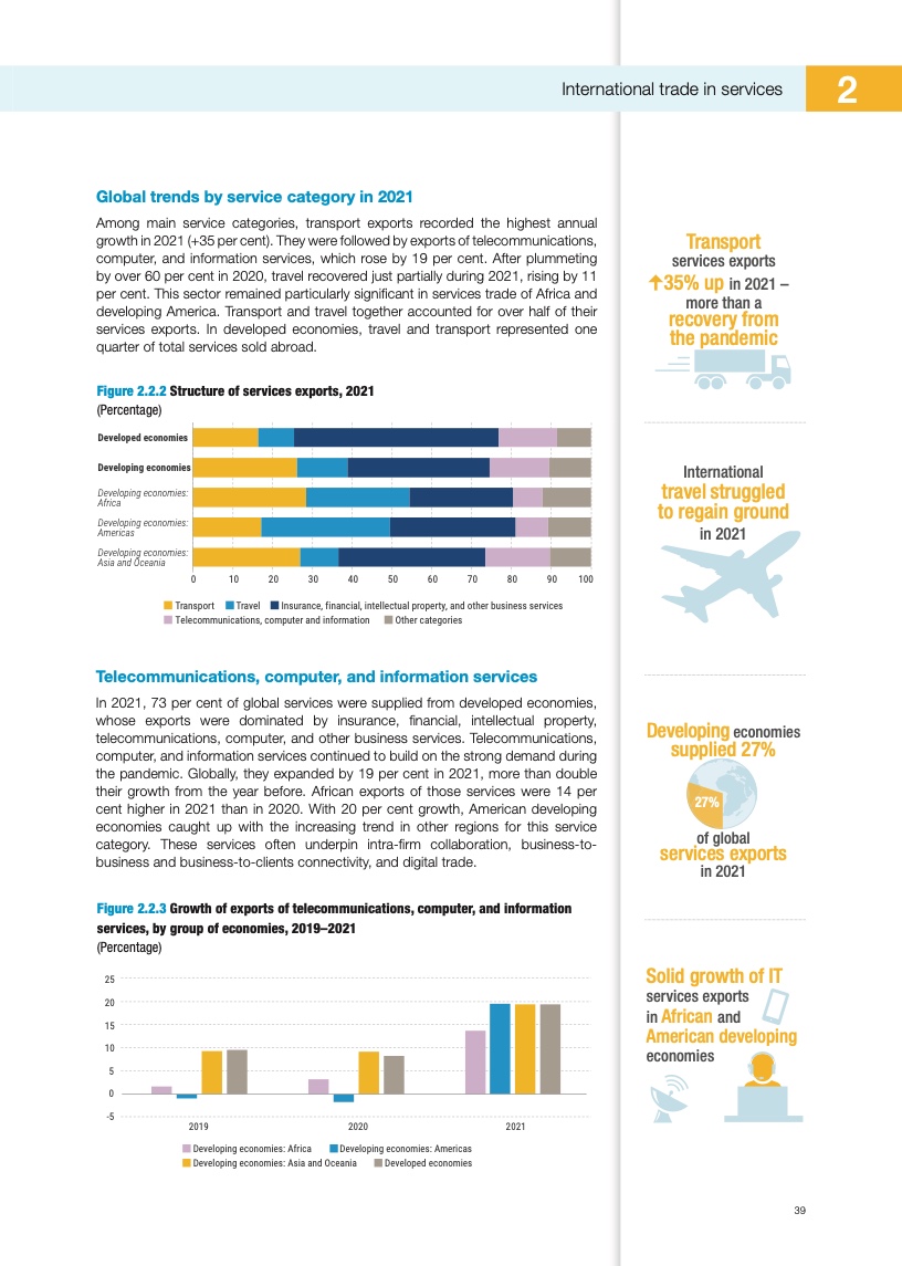 虽然2021年的服务贸易增长强劲,但总出口额(6.1万亿美元)仍低于2019年新冠疫情前的水平(6.3万亿美元)。