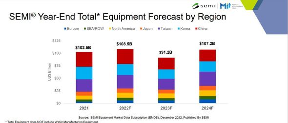 按地区划分,中国大陆、中国台湾地区和韩国预计在 2022 年仍将是资本投资前三名的国家。2023年,中国大陆仍将保持第一,但2024年,中国台湾有望夺冠。预计 2022 年除韩国外所有地区的投资都将增加,但预计 2023 年大部分地区将下降,然后在 2024 年恢复。