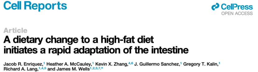 近日,来自美国辛辛那提儿童医院医学中心的James M. Wells教授团队在Cell Reports期刊上发表重要研究成果。结果表明高脂饲养24小时即可导致小鼠全身代谢改变以及诱导肠道细胞应激反应。一周内高脂饲料便诱导肠道上皮细胞向吸收“油脂”的方向转变。