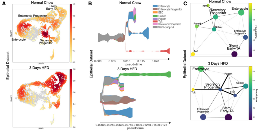最后作者猜想,既然短期内HFD造成了肠道细胞的转录组水平改变,那么随着HFD干预的推进,肠道细胞的分化谱系是否也会因为HFD而改变呢?为此,研究者们利用STREAM和PAGA两种单细胞拟时序分析方法对肠道细胞进化轨迹进行分析。