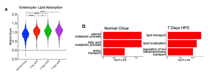 接下来,研究人员进一步探究了不同细胞亚群中细胞转录特征的改变。研究者们首先利用脂质转运及调控相关基因构建了一个脂质吸收评分。结果显示,HFD干预后肠道上皮细胞(Enterocyte)亚群中脂质吸收评分显著升高。同时GO富集分析显示,肠道上皮细胞转录特征向脂质转运通路富集。上述结果表明在短期HFD干预后,肠道上皮细胞增强了对脂质的吸收。