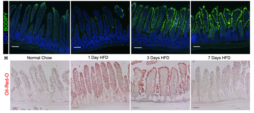 为了验证HFD干预后对肠道上皮细胞脂质吸收能力的影响,研究者们对肠道脂肪组织进行染色。发现HFD干预后1天、3天和7天后,BODIPY和油红O在肠道上皮细胞中均显著富集,证实肠道上皮在短期HFD干预后对脂质的吸收能力增强。