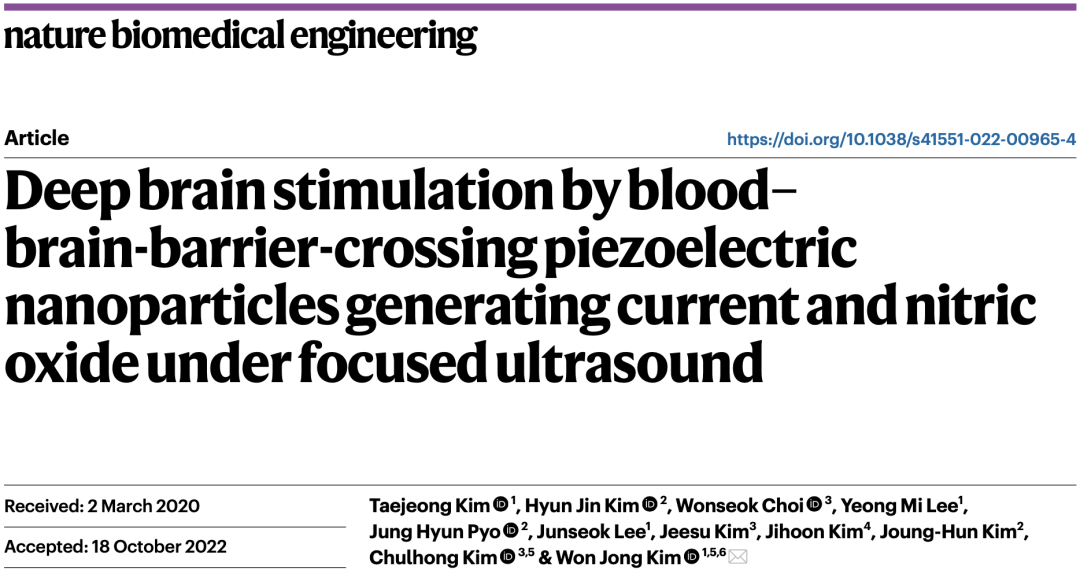5.Kim T, Kim HJ, Choi W, Lee YM, Pyo JH, Lee J, Kim J, Kim J, Kim JH, Kim C et al: Deep brain stimulation by blood-brain-barrier-crossing piezoelectric nanoparticles generating current and nitric oxide under focused ultrasound. Nat Biomed Eng 2022.