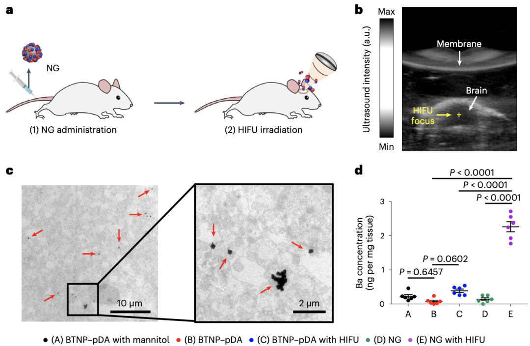 脑部给药最大的障碍就是血脑屏障,Kim团队发现BTNP–pDA–BNN6可以通过释放一氧化氮来打开血脑屏障。在给小鼠注射BTNP–pDA–BNN6,并使用高强度聚焦超声处理,可以观察到小鼠脑实质中纳米颗粒的浓度显著升高。