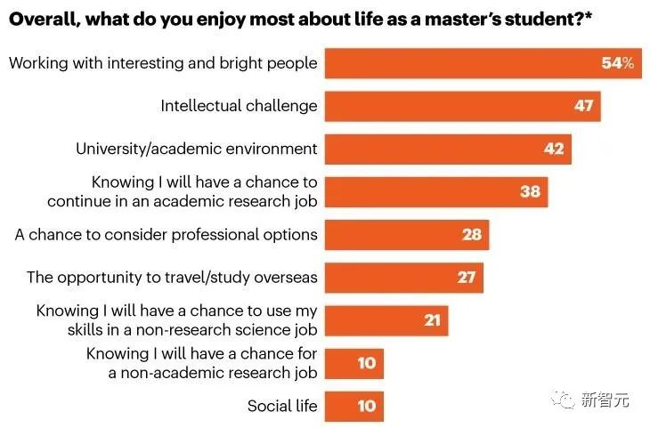 当被问及为什么欣赏自己的学术项目时,许多硕士生的第一回答是能和有趣聪明的人一起工作(54%);第二受欢迎的回答是智力上的碰撞(47%)。