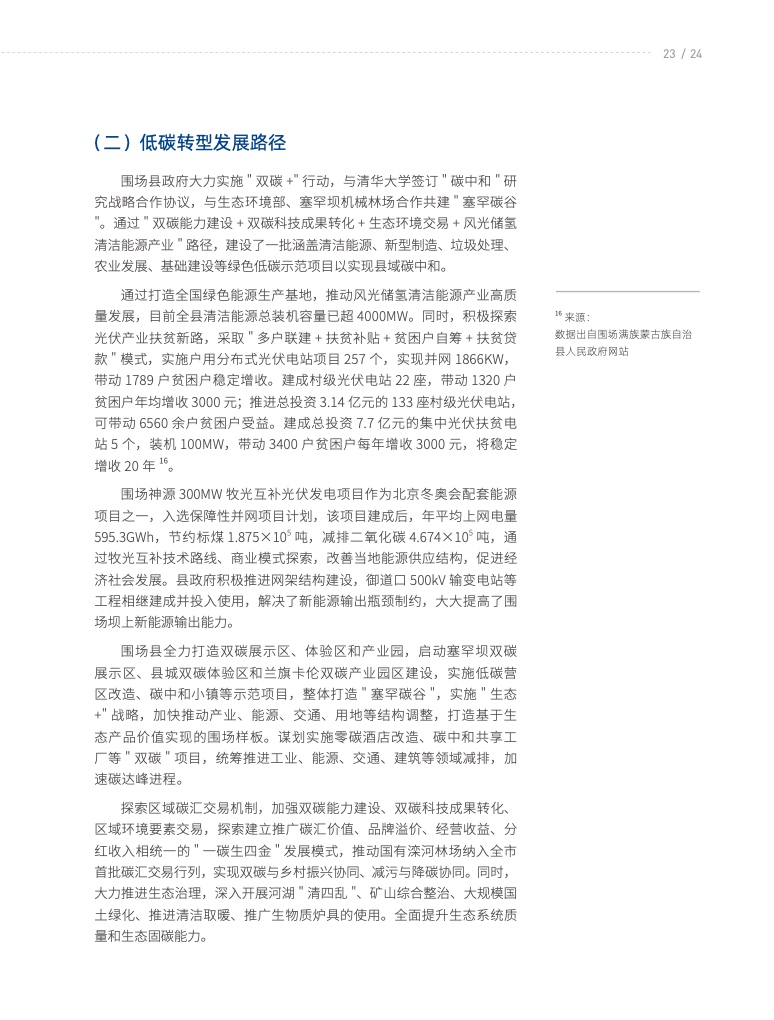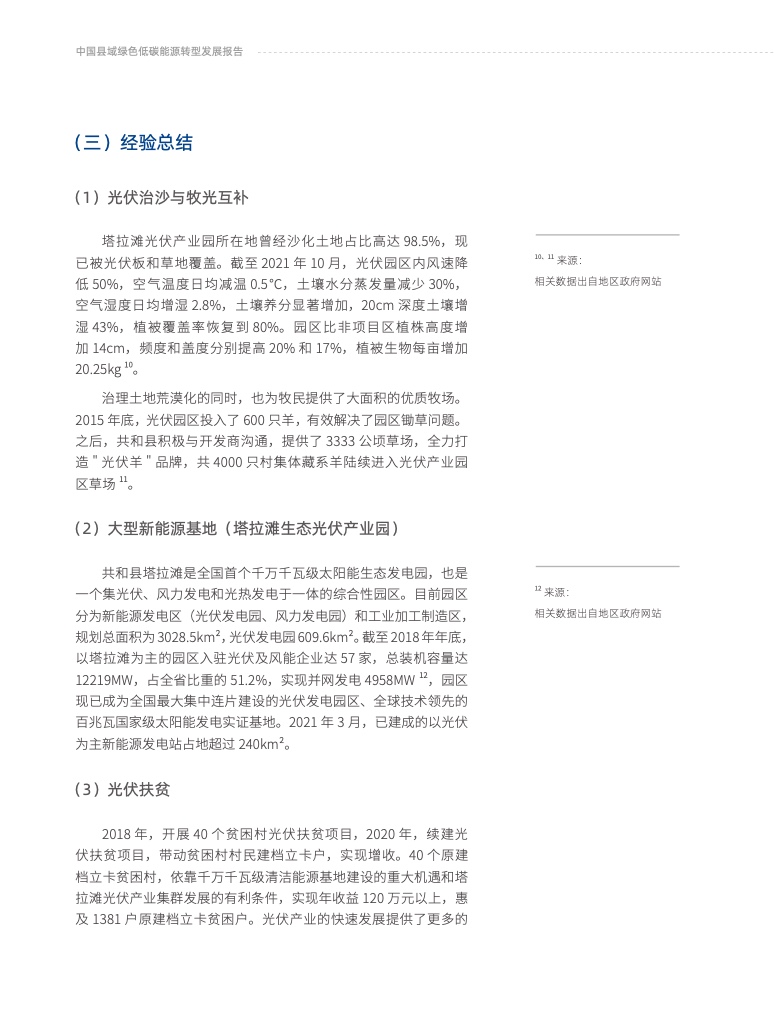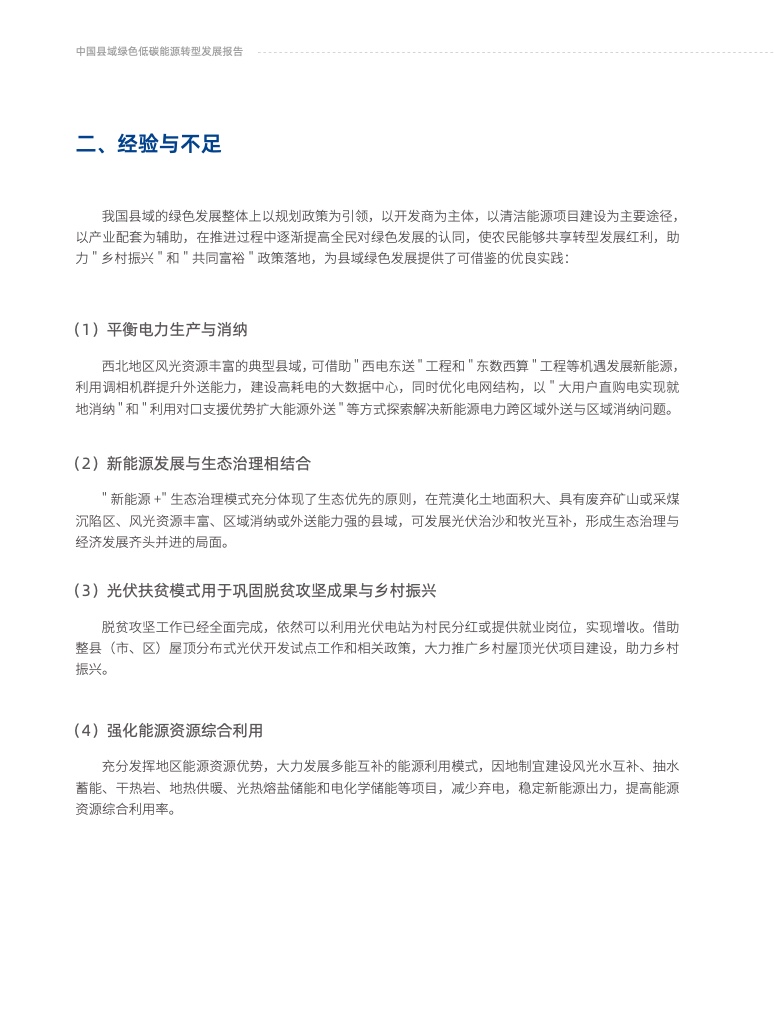 县域是区域发展的基石,是高质量发展的重要支撑,也是中国实现“3060”目标的关键力量。中国有近2000个县域经济体拥有丰富的资源禀赋,涵盖的人口数量超过7亿,贡献了2/5的国内生产总值。但与此同时,中国的县域在地域特点、资源禀赋、人口分布、发展水平、产业布局、能源结构上差异巨大,绿色低碳能源转型挑战与机遇并存。