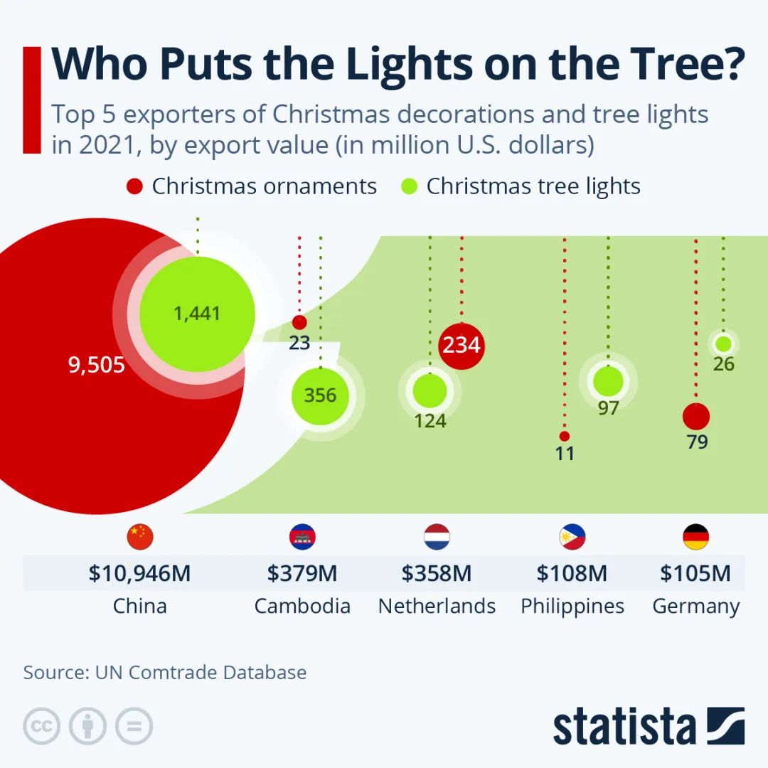 谁做的装饰品被挂在圣诞树上最多? 虽然有传言说圣诞老人的工厂隐藏在拉普兰的山区(或者在北极,取决于你问谁),但当涉及到圣诞装饰时,有这么一些人正在做着繁重的工作。 根据联合国商品贸易数据库的数据,中国占全球圣诞树灯饰出口的66%,占除蜡烛和天然树木外其他圣诞装饰品出口的90%。 如下图所示,在将节日气氛融入家庭方面,没有哪个国家能与中国相提并论。2021年,中国的圣诞产业出口总额为109亿美元,令排名第二和第三的柬埔寨和荷兰相形见绌。 这张图表显示了2021年按出口额计算的五大圣诞装饰品和圣诞树彩灯出口商。数据来源:Statista.com 更多阅读:哪个国家摆放真的圣诞树最多?YouGov:45%的美国人更喜欢人造圣诞树途虎养车:2018中国汽车用户线上养护行为报告Nature:携带相同基因组的癌细胞或许会表现出不同的行为!自如研究院:2021年10城毕业生租房报告国际顶刊《PNAS》:爱发朋友圈的人,更容易长寿在中国,只抓一个权健是不够的世界各城市60平米房屋成本2026风味趋势图谱:面向未来World Inequality Lab:2026年世界不平等报告亚洲水发展展望2025:亚太地区水安全指数全球无酒精市场:功能性替代品实现11%增长全球起泡酒市场韧性凸显:Z世代与千禧一代驱动消费结构转型2025年最严峻住房需求报告:美国低收入租房危机全景中汽数研:2025年11月纯电汽车保值率小米SU7达81.5%居首