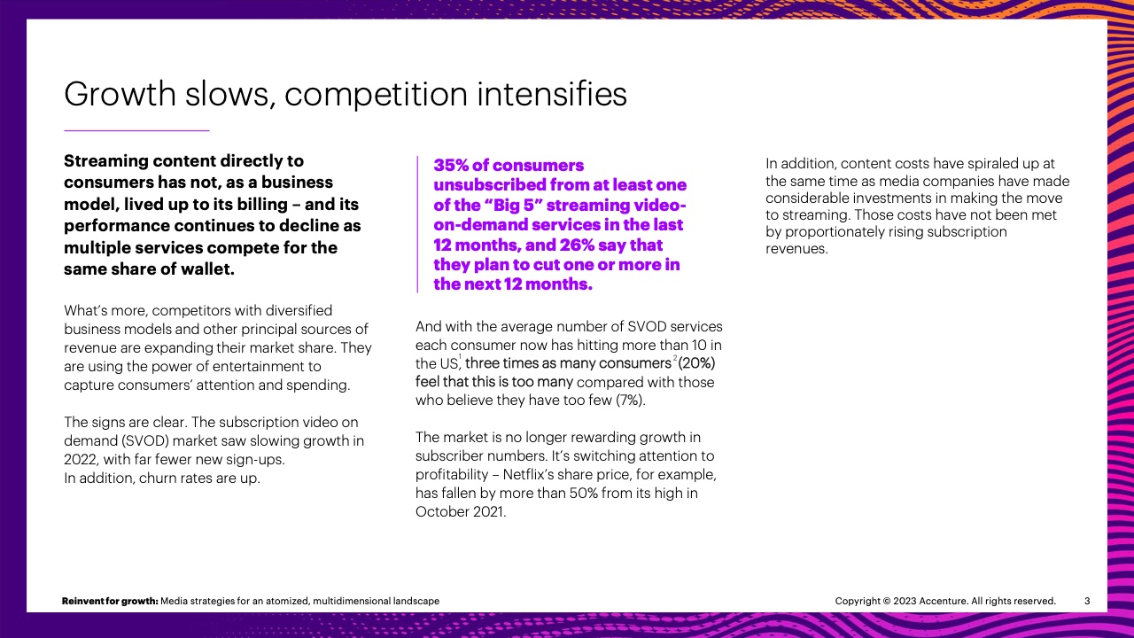 “独立的流媒体服务正面临一些简单的问题:消费者愿意支付的付费内容是有限的,而且他们准备应对的选择和复杂性也存在限度,”埃森哲媒体与娱乐行业业务的董事总经理约翰·彼得斯(John Peters)说,“现在是重新构想娱乐生态系统的时候了,这样媒体公司就可以通过帮助消费者获得他们需要和想要的一切来实现盈利增长。”