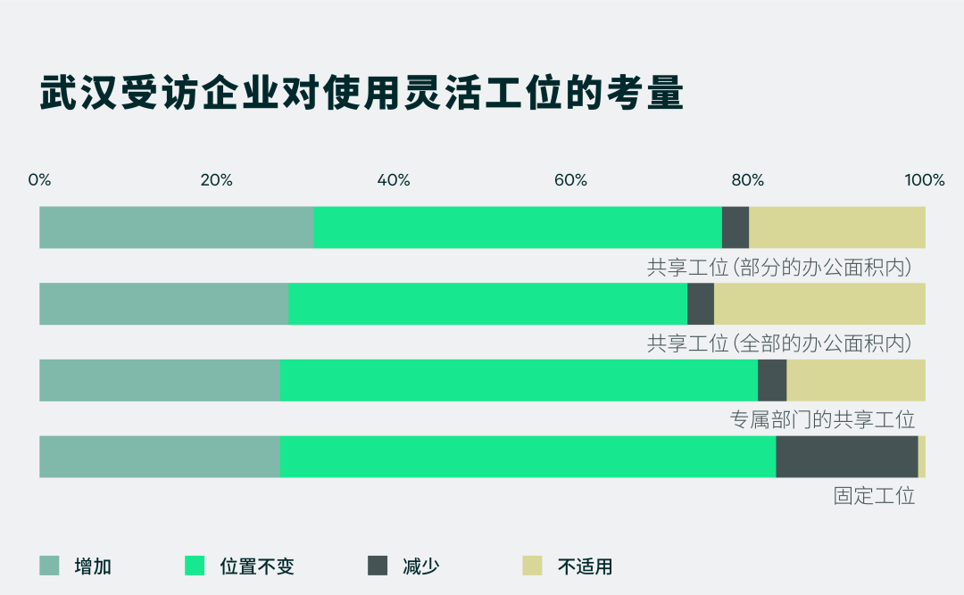 本次调查的结果显示,28%的受访企业将增加全部办公区域的共享工位数量,31%的企业将增加部分办公区域共享工位数量。