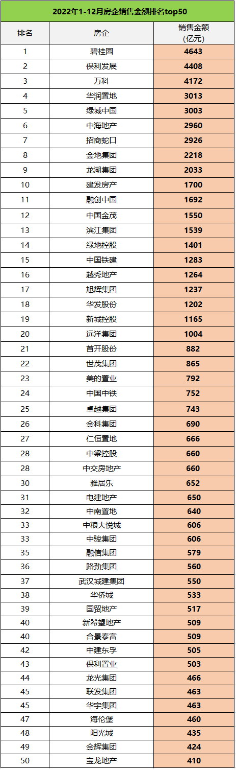 单个房企来看,2022年销售金额top3企业为碧桂园、保利发展、万科,销售金额分别为4643亿、4408亿和4172亿。去年同期,这三家企业的销售金额碧桂园7588亿、保利发展50439亿、万科6203亿,2022年的业绩同比之下缩水幅度分别为38.81%、18.96%、32.74%。