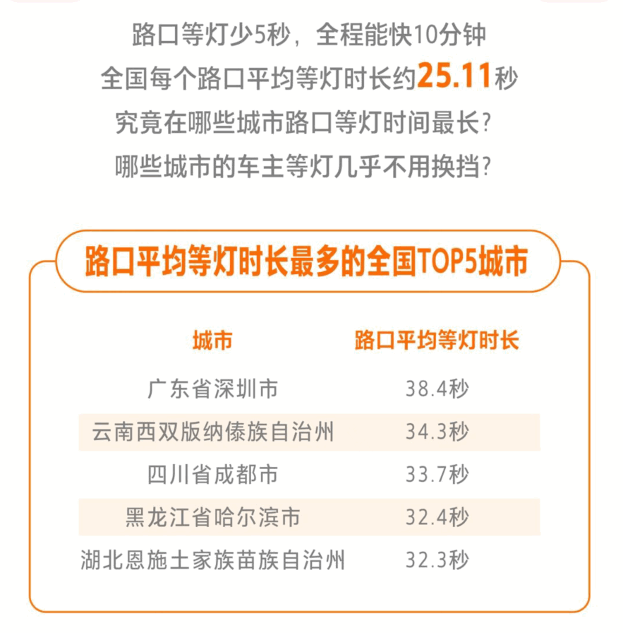 路口等灯少5秒,全程能快10分钟。元旦当天,全国每个路口平均等灯时长约25.11秒,而等灯时长最长的城市达到了38.4秒,最短的则为12.5秒,等灯时间足足差了三倍。