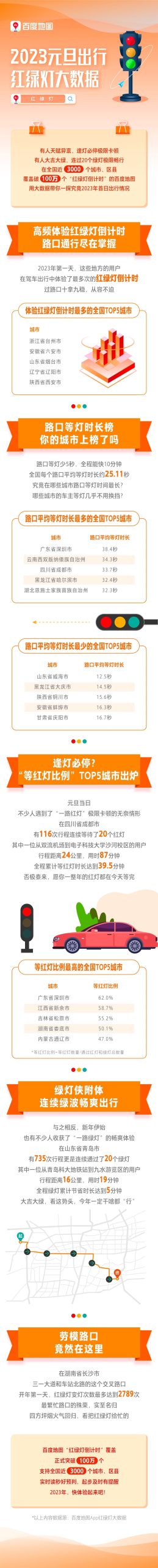 基于此,百度地图发布了“2023元旦出行红绿灯大数据”,展示了全国车主新年第一天的路口等灯情况。