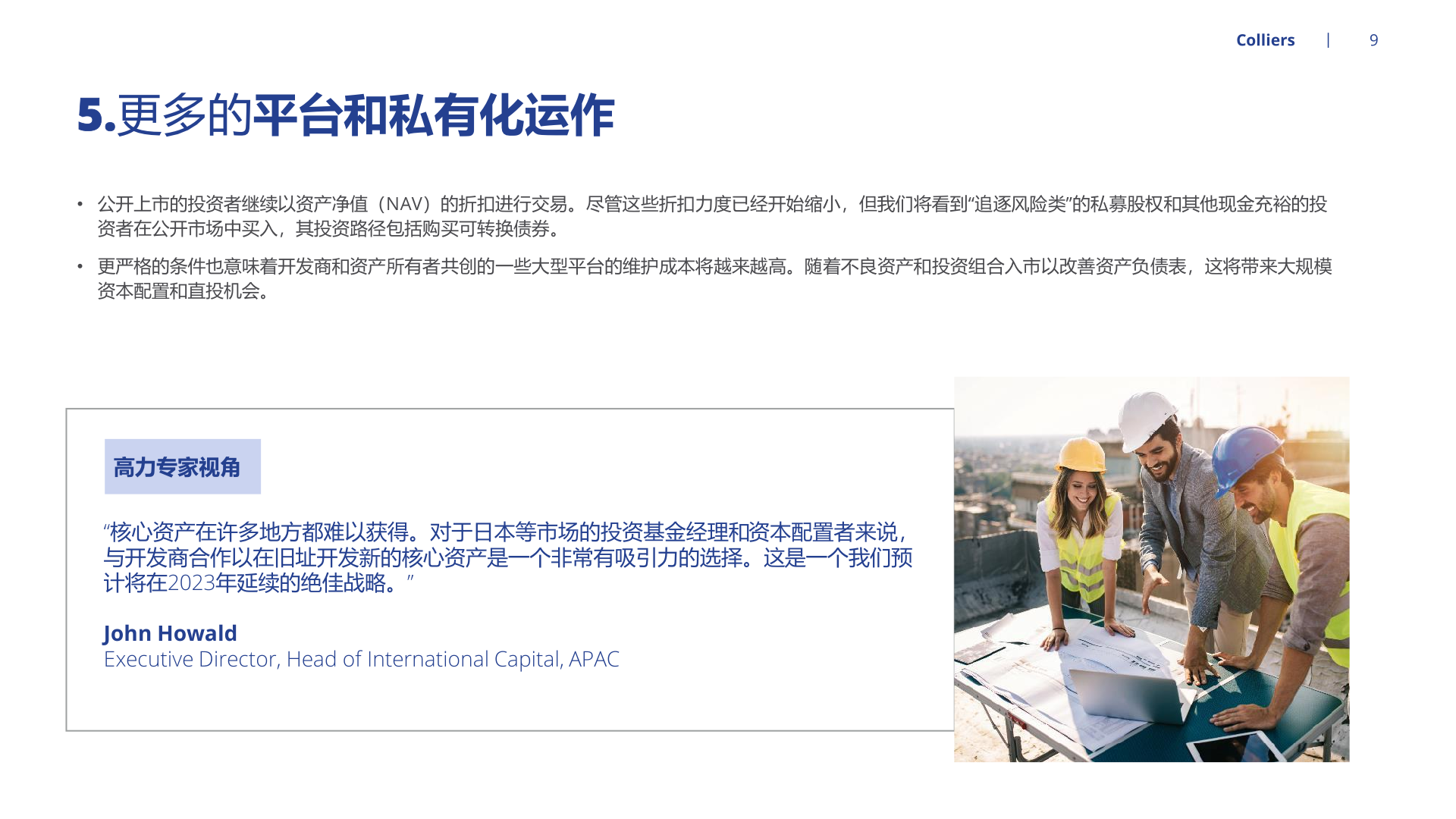总的来说,高力认为随着利率和经济前景更加确定,全球房地产市场的稳定态势将在2023年年中确立。