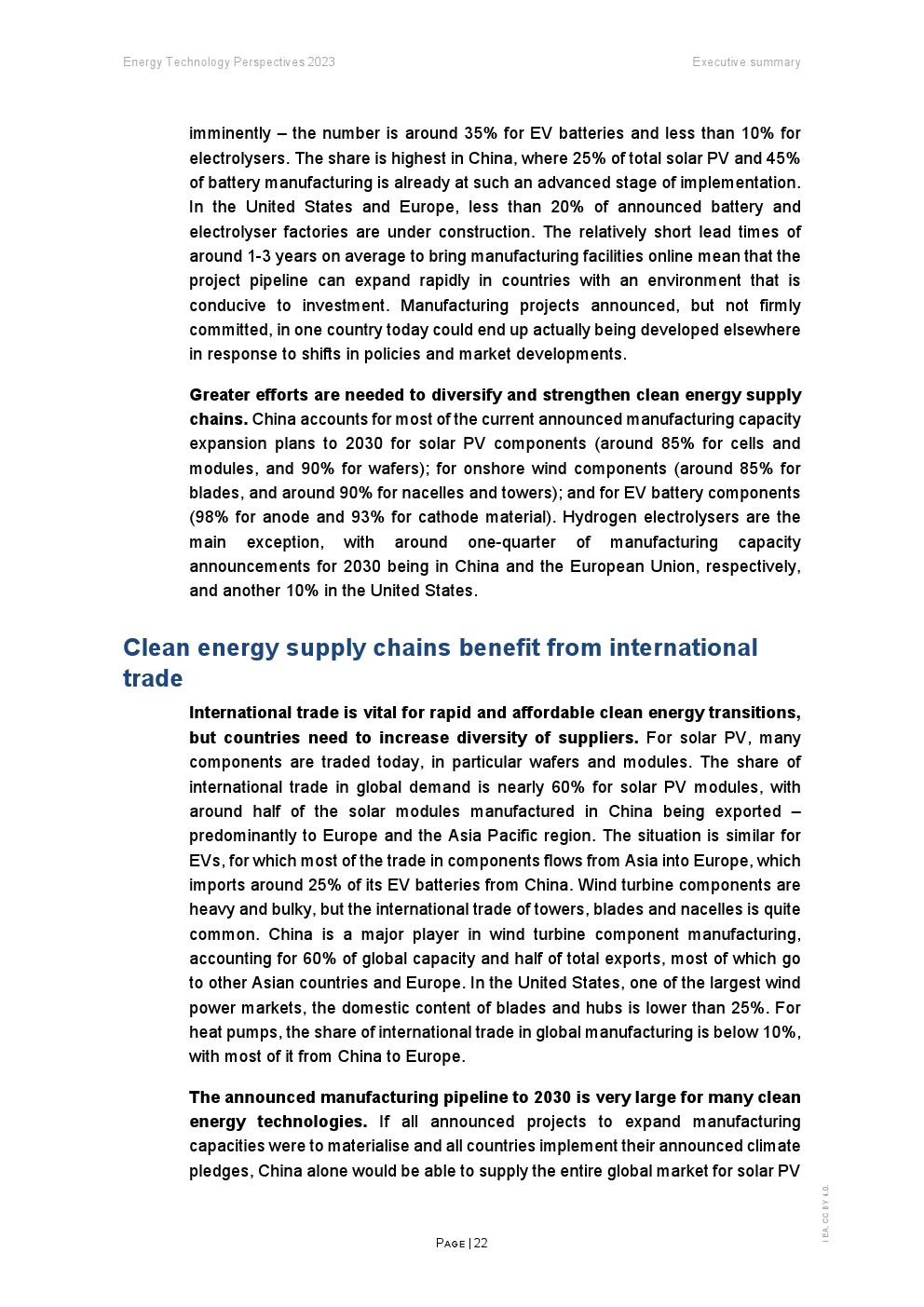 在扩大制造业规模的区域雄心方面,报告强调了国际贸易在清洁能源技术供应链中的重要作用。它表明,全球生产的太阳能光伏组件中有近 60% 是跨境交易的。尽管体积庞大,但贸易对电动汽车电池和风力涡轮机部件也很重要,目前中国是主要的净出口国。