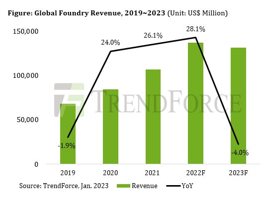 TrendForce 最近对代工市场的分析表明,对所有类型的成熟和先进节点的需求持续下滑。预计2023 年全球晶圆代工收入将同比下降约 4%。