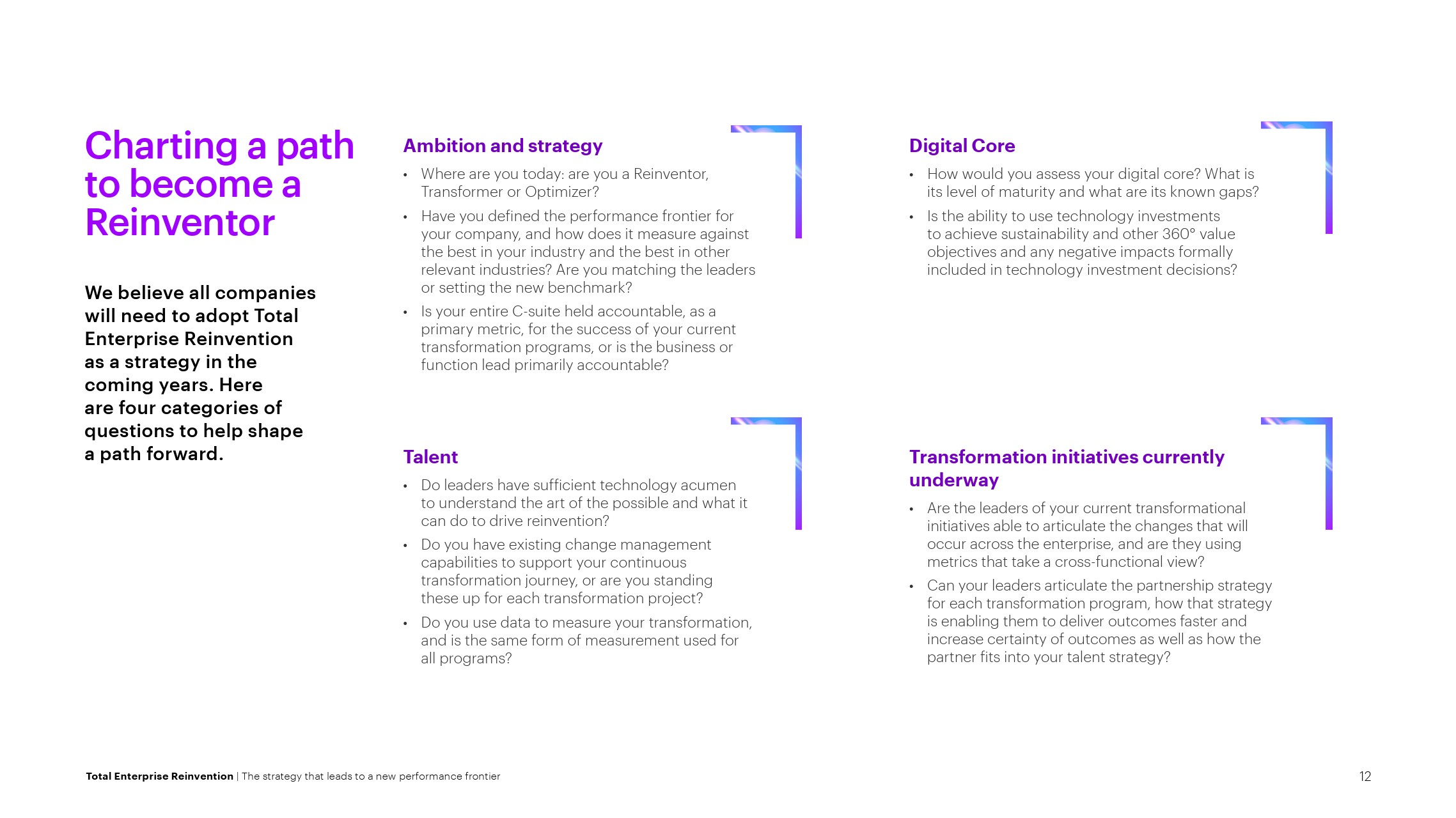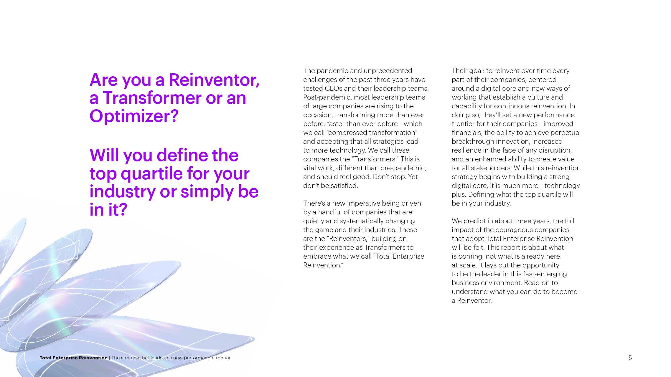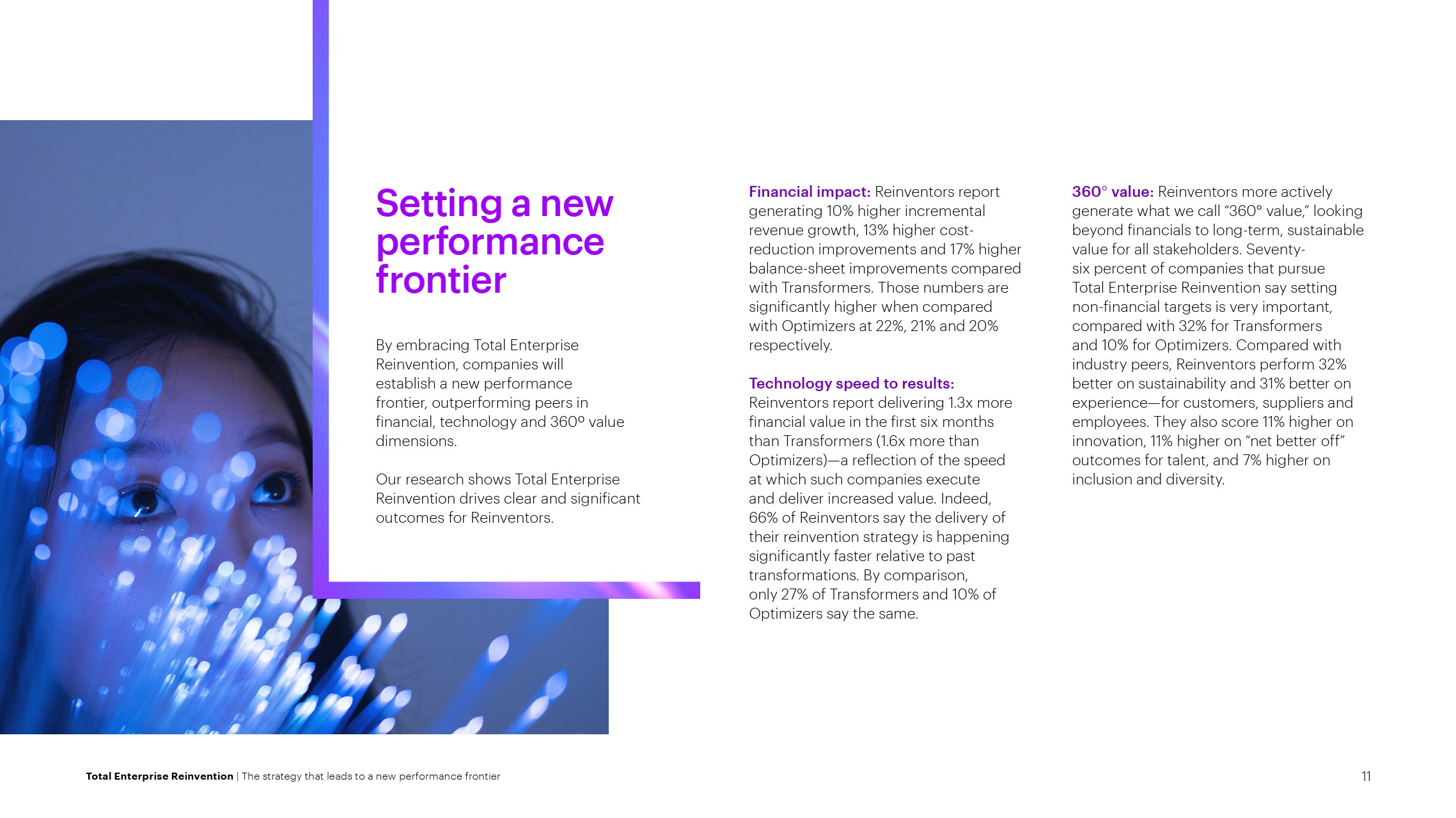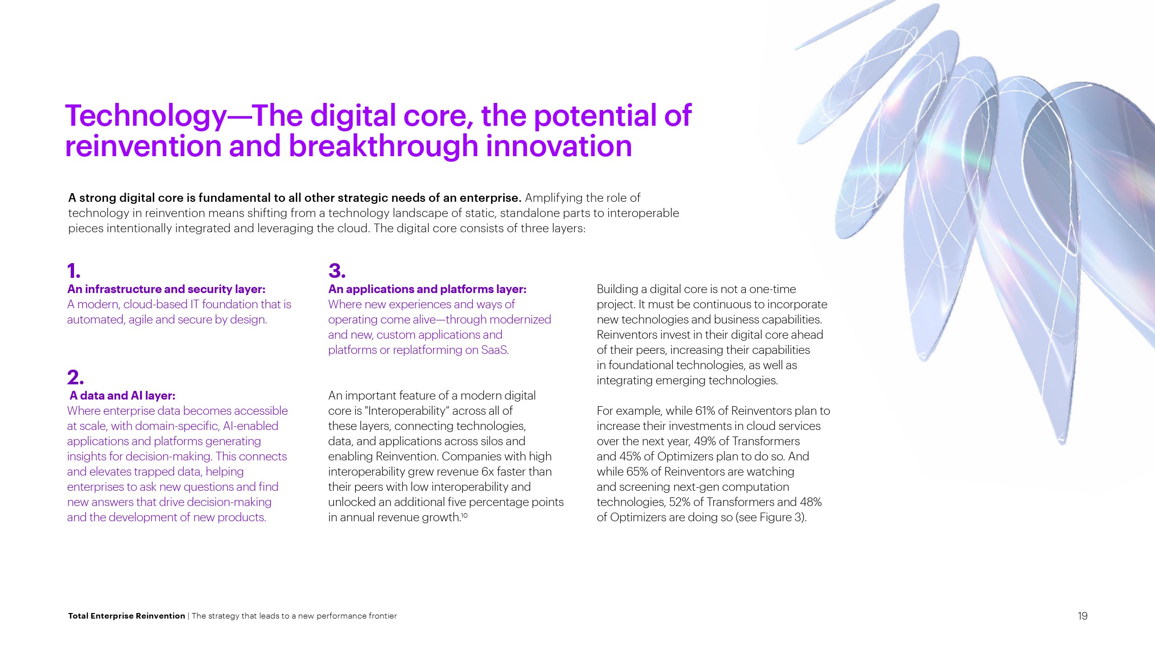 全面企业重塑是由人工智能和云计算等技术的进步推动的。如今,只有 8%的受访公司是“重塑者”,为自己以及在大多数情况下为所在行业设定了新的绩效边界。他们的转型以强大的数字核心和有助于优化运营和推动增长的新工作方式为中心。