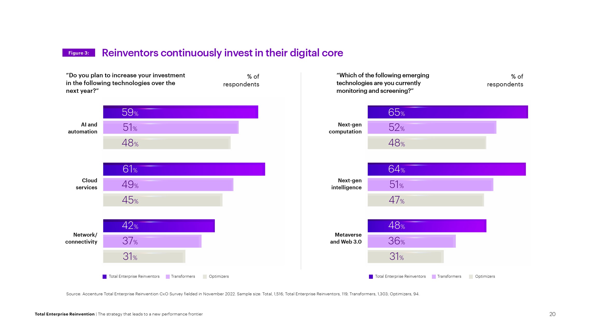 大多数公司(86%)专注于对其部分业务进行转型,并将转型视为一个有限的计划,而不是一个持续的过程。埃森哲将这些称为“转型者”。其余 6%的公司是“优化者”。