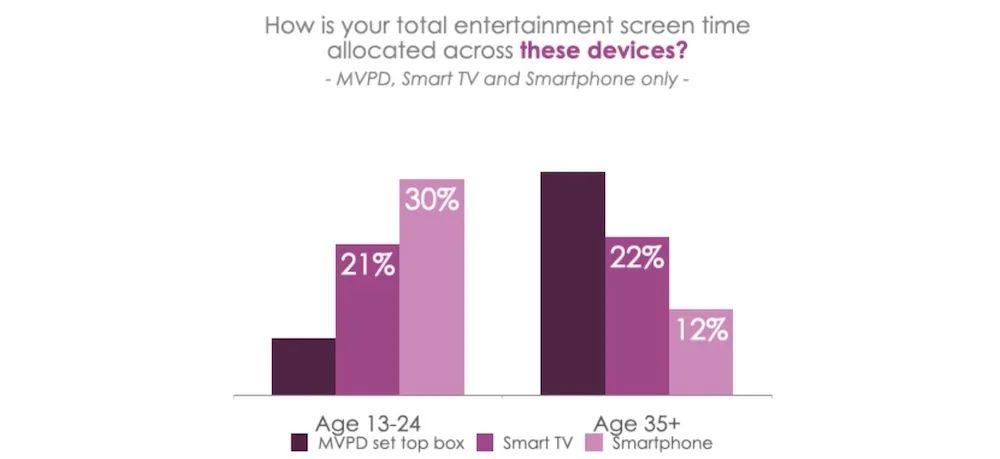 年轻消费者和年长消费者在内容上的差异也反映在他们使用的屏幕上。这两组人都将大约五分之一的屏幕时间分配给智能电视上的内容。但除此之外,两组的设备使用情况大不相同。年龄在35岁以上的观众表示他们约三分之一的屏幕时间是通过付费电视机顶盒观看的,只有12%的时间花在手机娱乐上。13-24岁的人花在智能手机上的时间最多(30%),只有8%的时间花在有线电视机顶盒提供的内容上。
