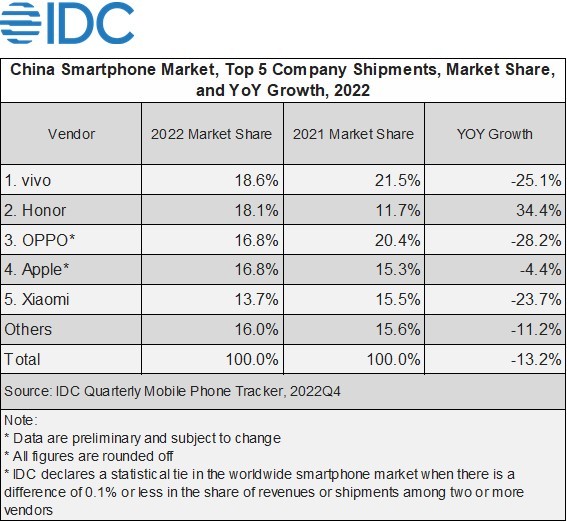由于较低的比较基准和积极的产品组合开发,荣耀是前五大品牌中唯一在 2022 年实现增长的。在 2022 年第四季度,苹果位于郑州的 iPhone 组装工厂在 12 月设法恢复了正常生产速度。 生产恢复以及光棍节在线购物节使苹果能够保持季节性环比增长。