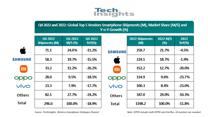 TechInsights高级总监隋倩表示:“2022年Q4,全球智能手机出货量同比下降19%,至2.96亿部 ——这是智能手机销量连续第六个季度出现年度下滑。库存调整、新冠疫情的供应分配和地缘政治问题对Q4的智能手机市场产生了不利影响。与此同时,不利的经济环境继续削弱消费者对智能手机和其他非必需品的需求。”