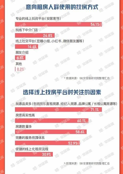 对当代租房人群来说,除了住房空间,他们还渴求生活的便利性。因此,专业的线上找房平台成为了他们的首选。58同城、安居客《2023节后返城租房调查报告》显示,有54.1%的租房人群在寻找房源时使用专业的线上找房平台,24.8%的人会选择通过线下中介门店找房。