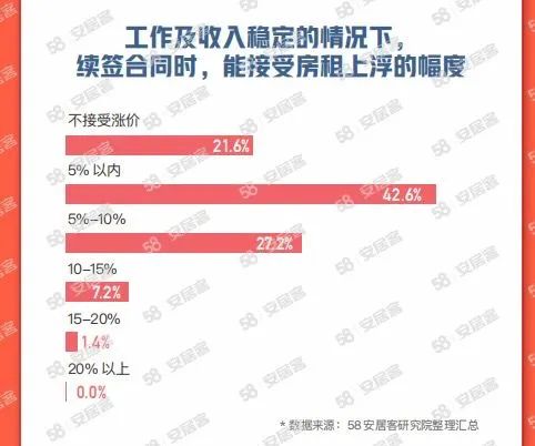 押一付三作为主流的房租支付方式,已被大部分人接受,58同城、安居客《2023节后返城租房调查报告》显示,对于房租的支付方式,33.8%的意向租房人群接受季付的方式。另外还有三成意向租房人群选择半年付,有22.2%的意向租房人群希望可以月付租金。对于房租的上浮空间,在工作及收入稳定的情况下,续签合同时,大家普遍能接受5%以内的租金上涨,占比42.6%;接受10%以上租金上涨的人群占比不足10%。此外,也有超两成的人群表示不能接受租金上涨。