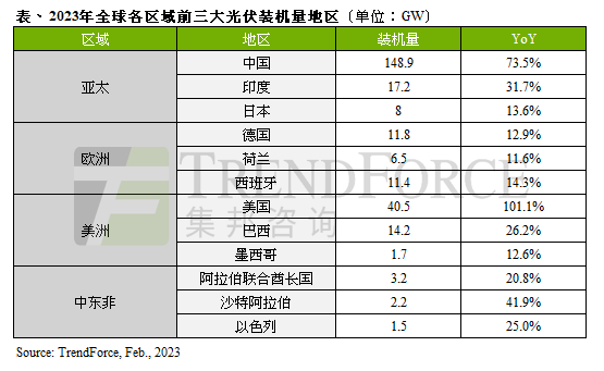 从 TrendForce 集邦咨询研究报告中得知,2023 年光伏装机需求量由高至低依序为亚太、欧洲、美洲及中东非地区。