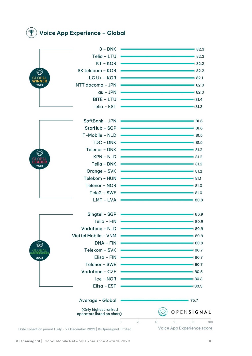 Telia Finland 是卓越质量的唯一全球赢家,与 Telia Estonia 分享该奖项。这两家运营商以 90.8-91.1的统计分数并列赢得了该奖项。Telia Finland 以 97.2的得分夺冠,以微弱优势领先 TDC Denmark 和 Elisa Finland,后两者得分97分。