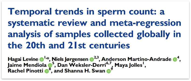 [1] Levine H, Jørgensen N, Martino-Andrade A, et al. Temporal trends in sperm count: a systematic review and meta-regression analysis of samples collected globally in the 20th and 21st centuries. Hum Reprod Update. 2022 Nov 15:dmac035.