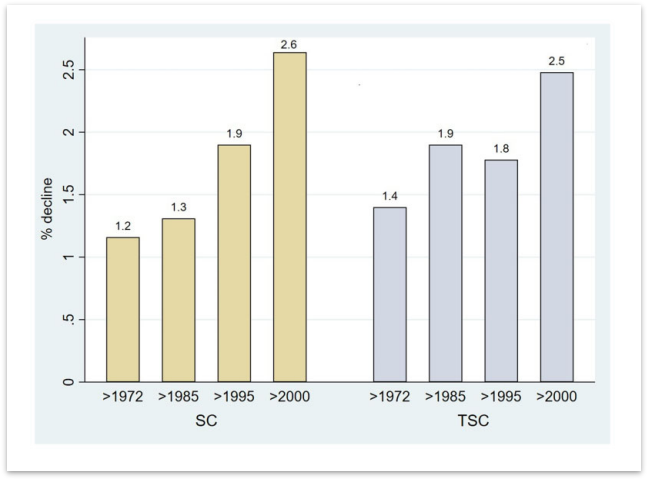 图:不同时间内尚未选择生育组男性SC和TSC下降情况(来源:[1])