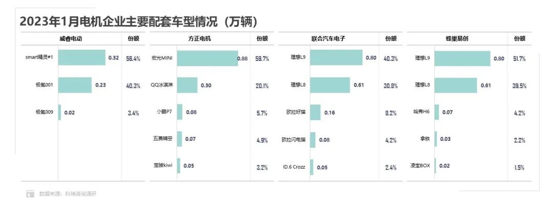 据介绍,今年 1 月 Top10 的电机配套企业合计配套量超 25.1 万辆,整体市场配套量下滑 2.5%。相比同期而言,蜂巢易创、威睿电动新增配套车型对其配套量增长助益颇多。重点车型引入配套对于电机企业配套量影响较大。