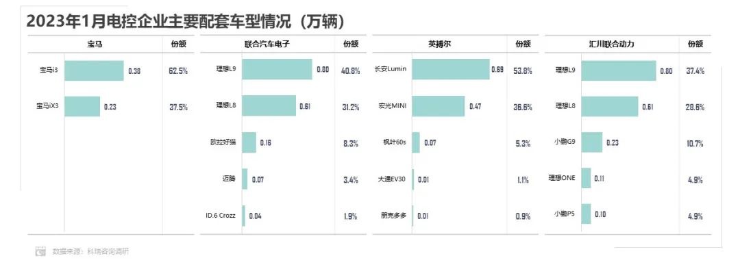今年 1 月前十大电控配套企业合计配套量超 25.9 万辆,合计占比 82.8%,行业集中度环比上升 14.7%。特斯拉、蔚来、宝马电控配套量环比降幅相对较小,三家企业均为豪华品牌自主配套企业,与自身车型销量状态保持统一。