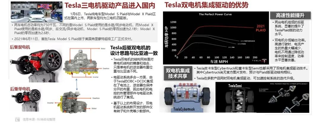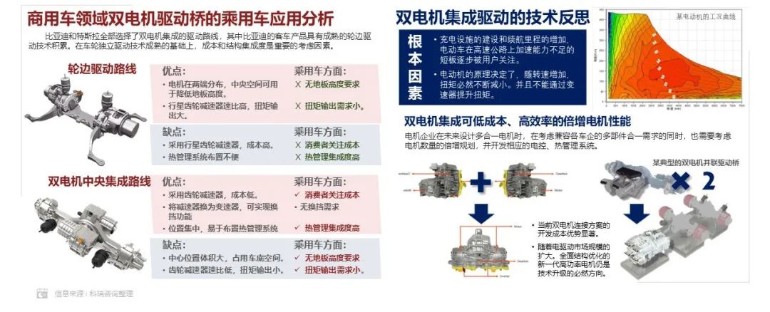 乘联会指出,双电机集成驱动,低成本、高效率的解决了电动车高速行驶扭矩低的问题。两台电机的并联是最快速、最高效的功率倍增路径,但仍有性能和结构的优化空间。