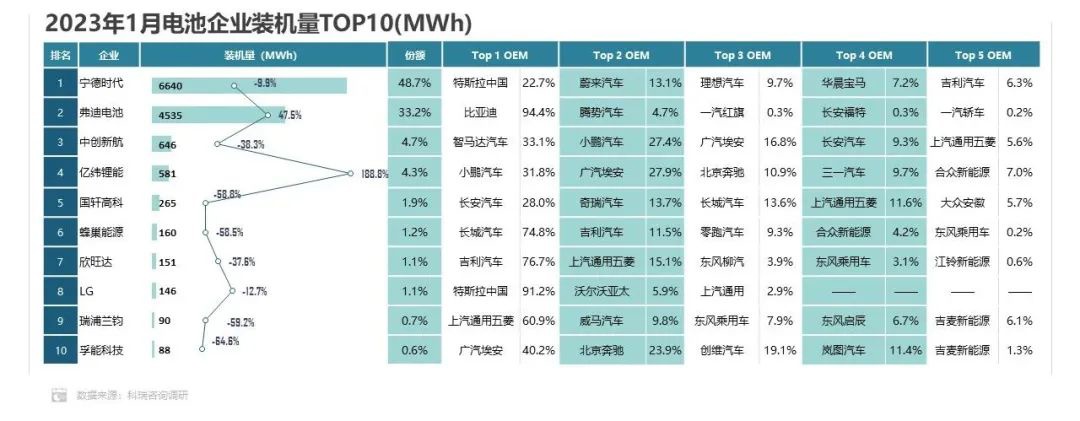 今年 1 月多数企业出现销量同比下降现象,不过宁德时代依然是动力电池行业的霸主,凭借 48.7% 的市场份额依然保持领先地位,而亿纬锂能成为 1 月 TOP10 企业中增幅最高的电芯企业。