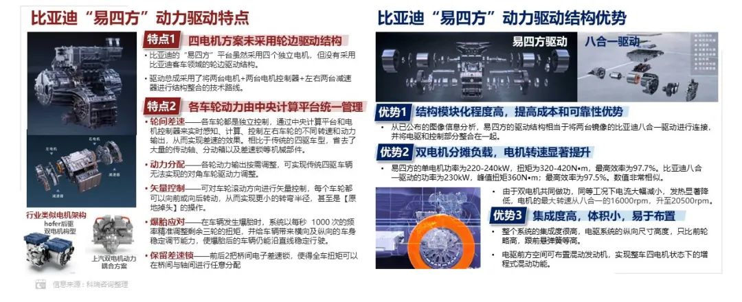 首先,比亚迪易四方动力采用双电机电驱桥相似的架构,实现了四轮独立驱动。通过将两个成熟单电机驱动进行整合,提升性能的同时,提高了技术的可靠性。