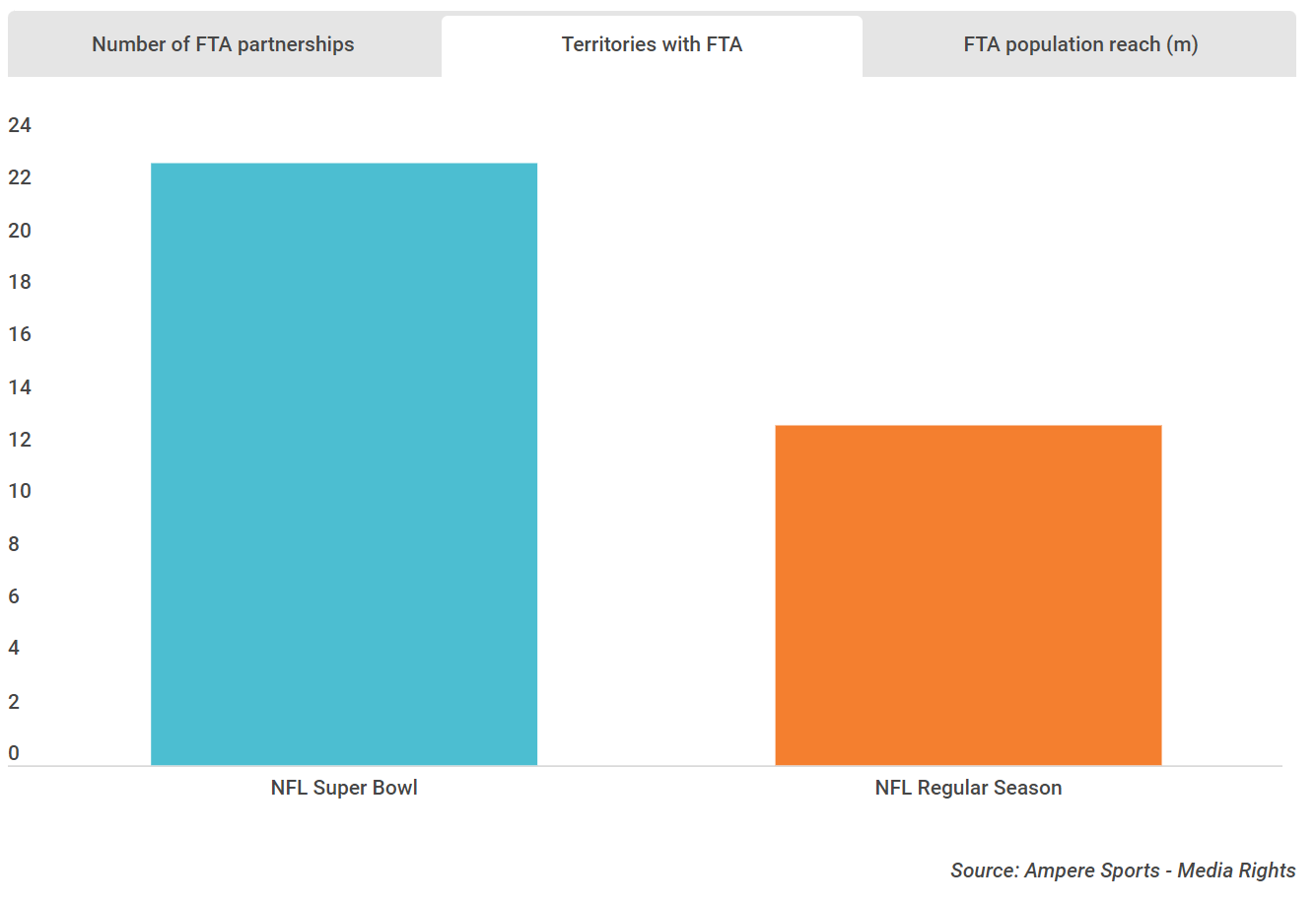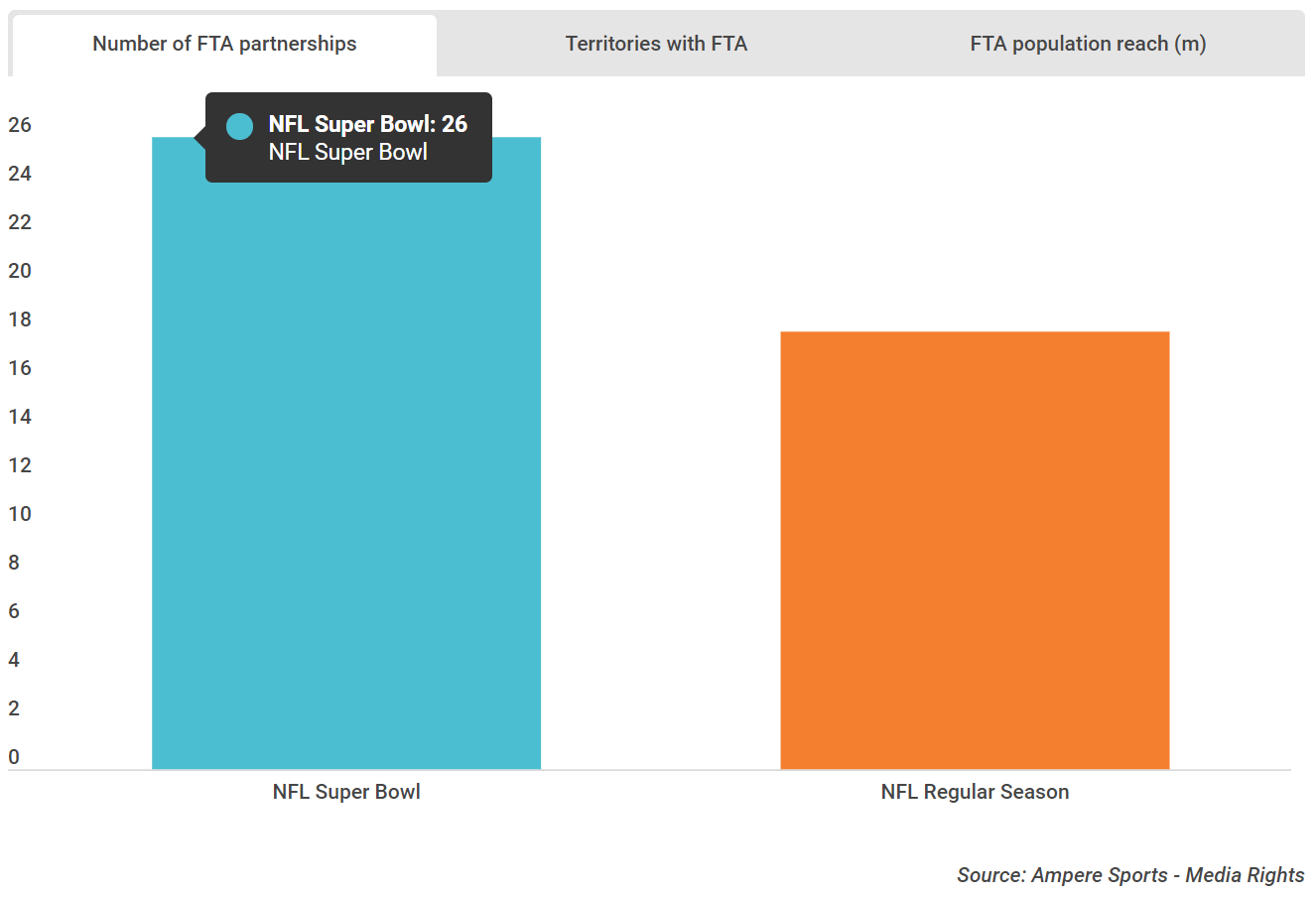 根据 Ampere的数据,NFL 拥有 213 个广播合作伙伴,用于直播 52 届超级碗,覆盖 168 个地区。 大多数广播合作伙伴是付费电视和付费频道合作伙伴(88%),但超级碗作为一项重要赛事,其免费转播(FTA)覆盖面比常规赛季更大:与常规赛季的 18 个转播合作伙伴相比,今年的赛事有 28 个免费转播。但是,最显著的区别是可以观看 FTA 赛事的地区规模:超级碗的 FTA 广播受众为 28 亿人,而NFL 赛季常规赛为 8.7 亿人,FTA 在中国的分布是一个关键因素。