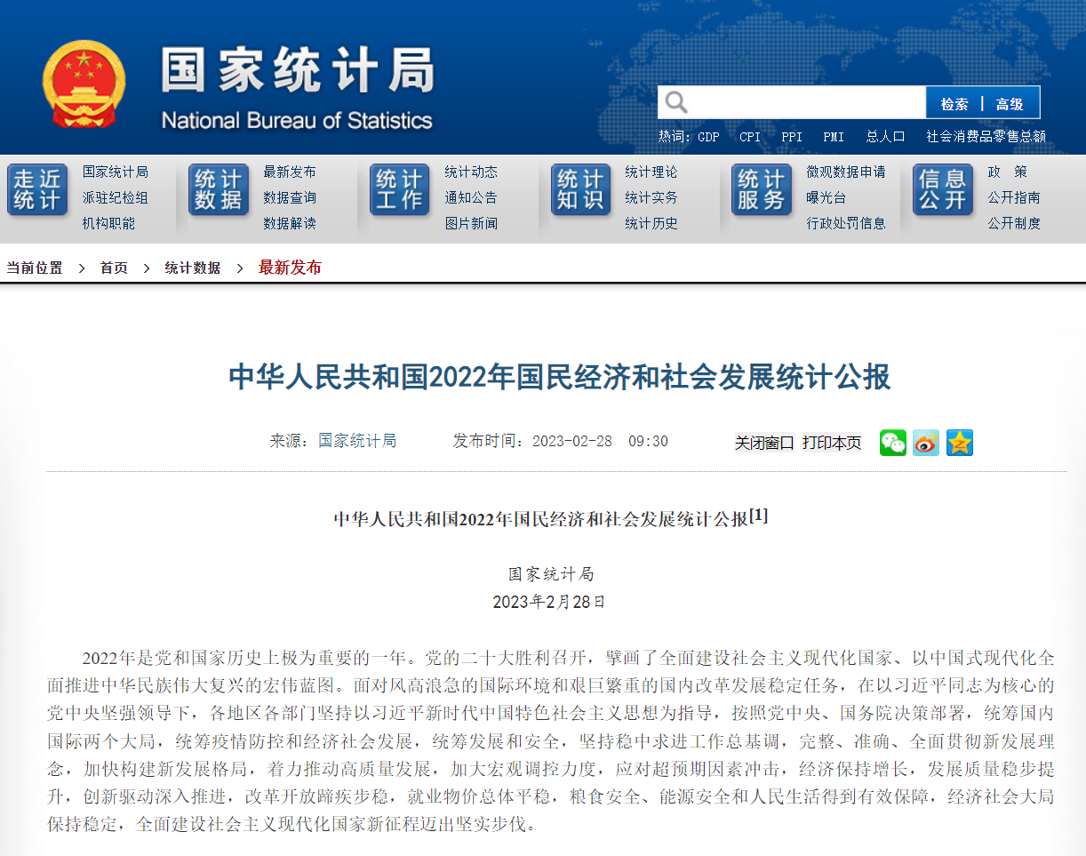 国家统计局发布了 2022 年国民经济和社会发展统计公报(下文简称“统计公报”)。初步核算,全年国内生产总值 1210207 亿元,比上年增长 3.0%。其中,第一产业增加值 88345 亿元,比上年增长 4.1%;第二产业增加值 483164 亿元,增长 3.8%;第三产业增加值 638698 亿元,增长 2.3%。