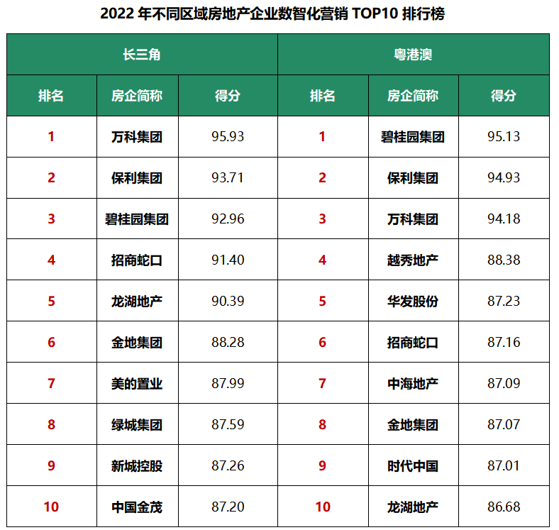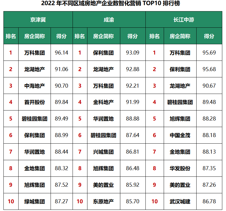 三、2022年房企数智化营销排名榜:全国榜万科、保利、碧桂园居前三;五大都市圈万科领衔长三角、京津冀、长江中游,碧桂园深耕粤港澳,保利争先成渝。