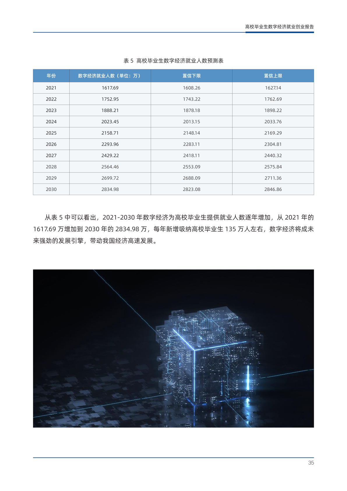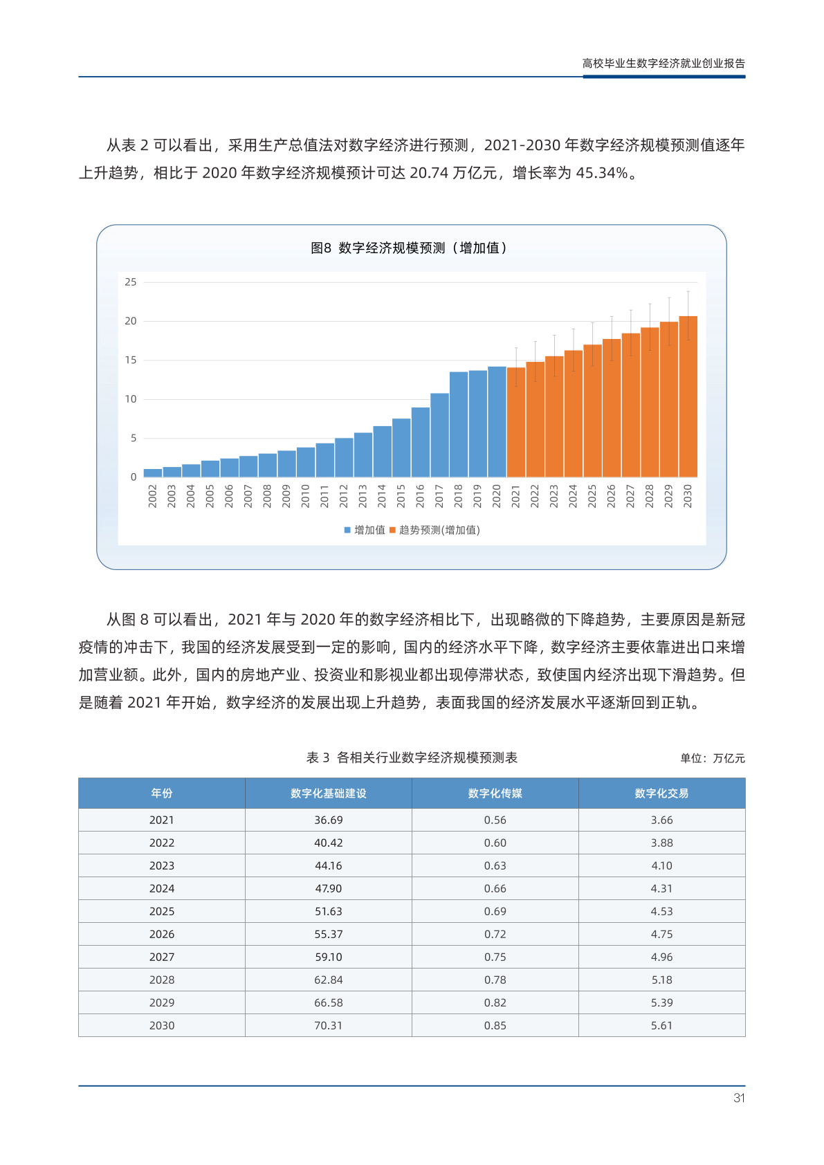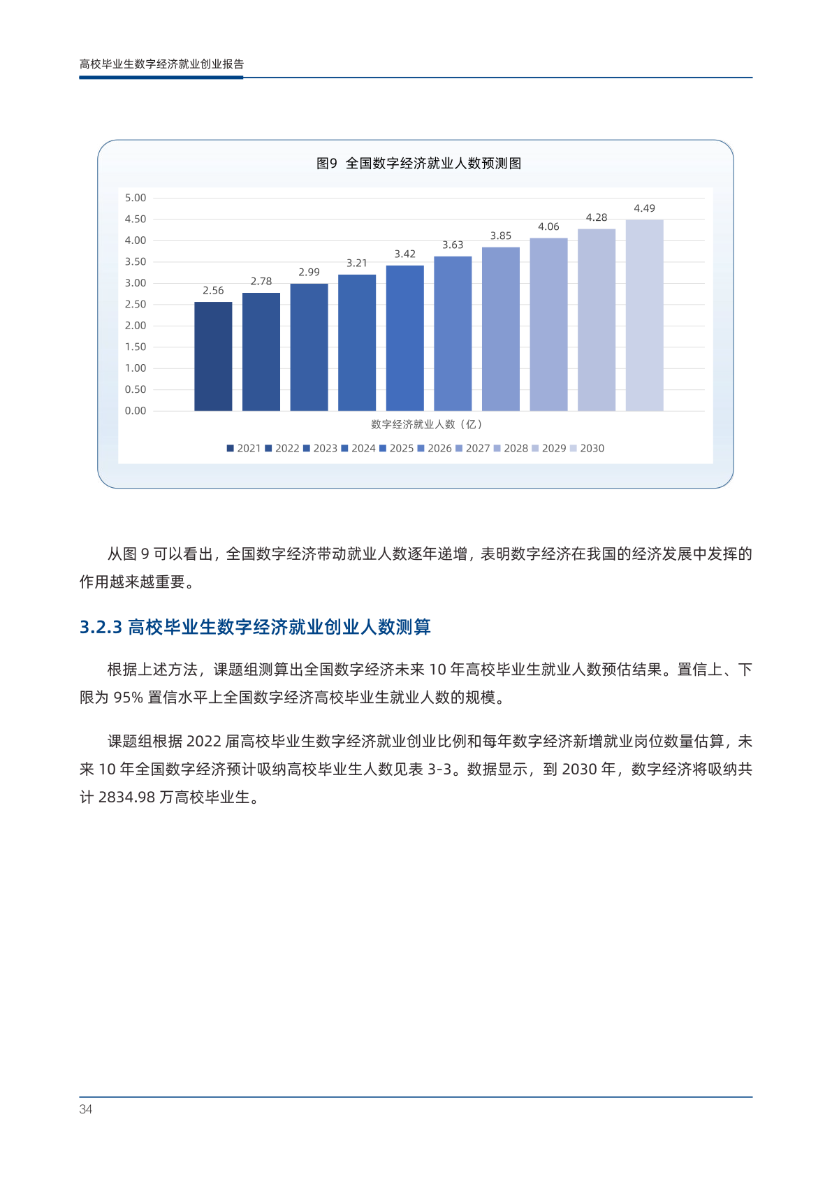 报告预测,到2030年,数字经济将带动就业人数达4.49亿,为高校毕业生提供就业岗位2834.98万个,与2021年相比预计增加1200多万。数字经济将阶段性成长为新就业岗位的“孵化器”和“蓄水池”,“平台型就业”,“生态圈就业”逐步成型。