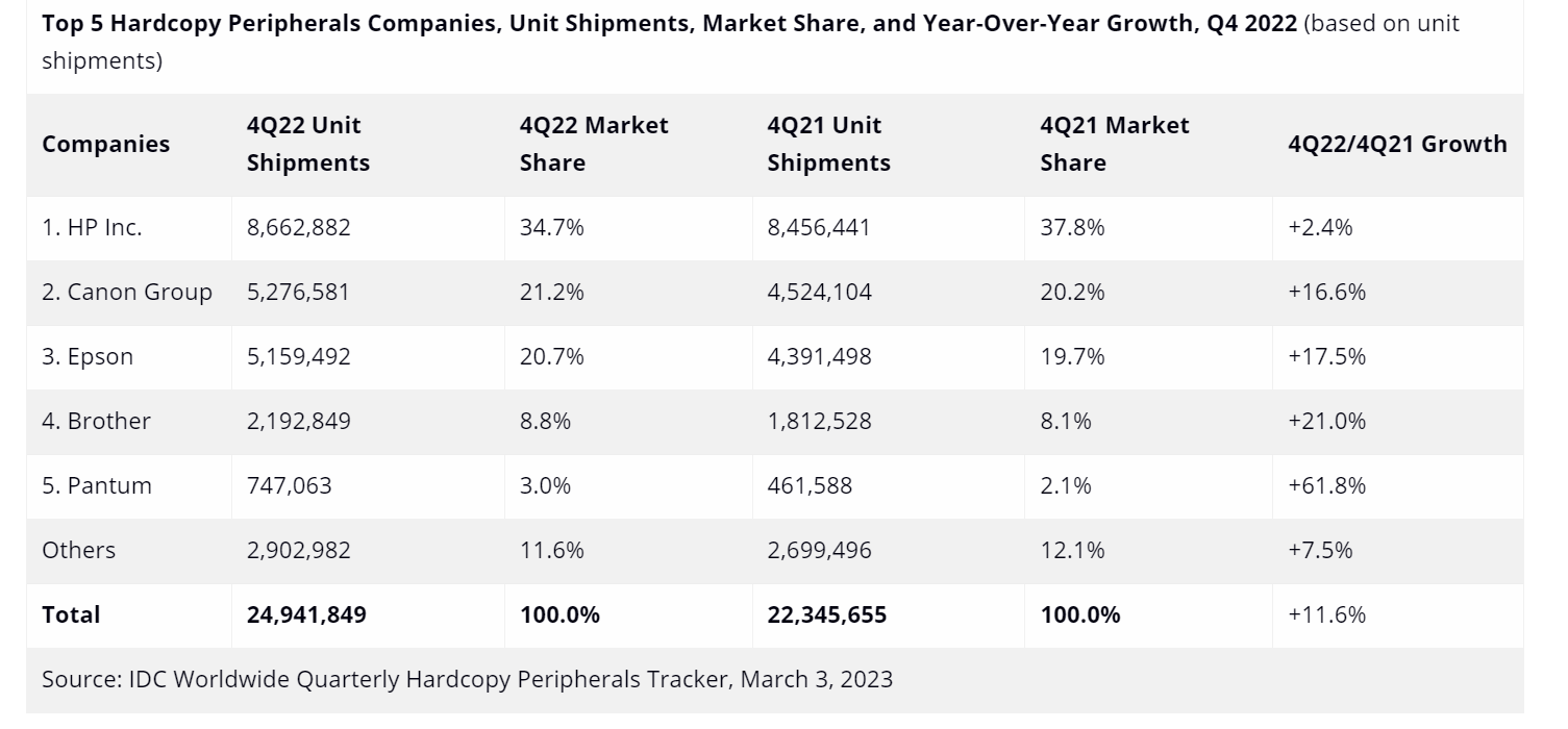 2022 年第四季度,全球打印外设市场整体出货量同比增长 11.6%,达到近 2500 万台。根据IDC的预测,本季度的出货量增长了14.8%,市场达到 111 亿美元。