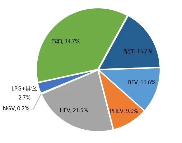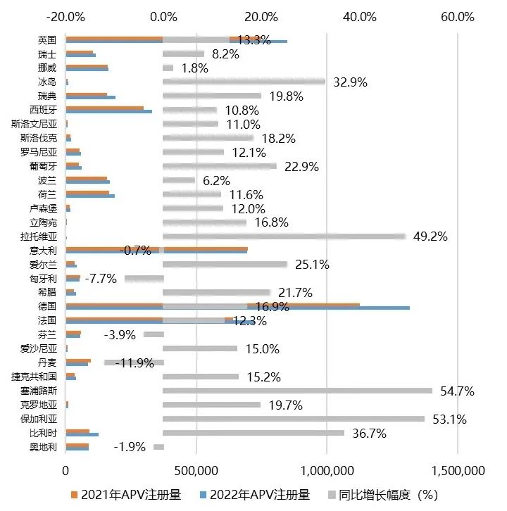 图1 2022年欧洲替代动力乘用车(APV)注册量分类型渗透率情况