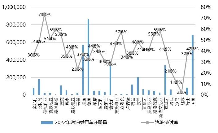图9 2022年欧洲各个国家汽油乘用车注册量和注册量渗透率情况