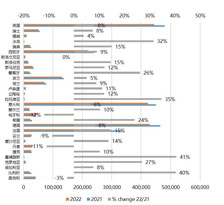 图3 2022年欧洲国家替代动力乘用车注册量和注册量同比变化情况