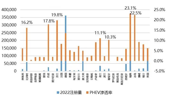 图7 2022年欧洲各个国家PHEV乘用车注册量渗透率情况