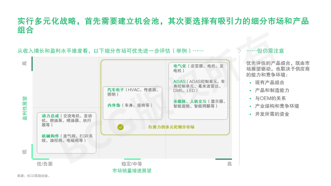 在战略设计上,根据产品类型去寻找和确定业务组合的新支点至关重要。对于传统零部件业务,在推陈出新的阶段我们认为还可以采用“最后赢家策略”,结合私募基金思维方式实现利润优化。对于通用沿用类和新型发展类零部件业务,在充分考虑自身能力、竞争环境、细分市场机会池吸引力的基础上建立多元化战略则是关键。