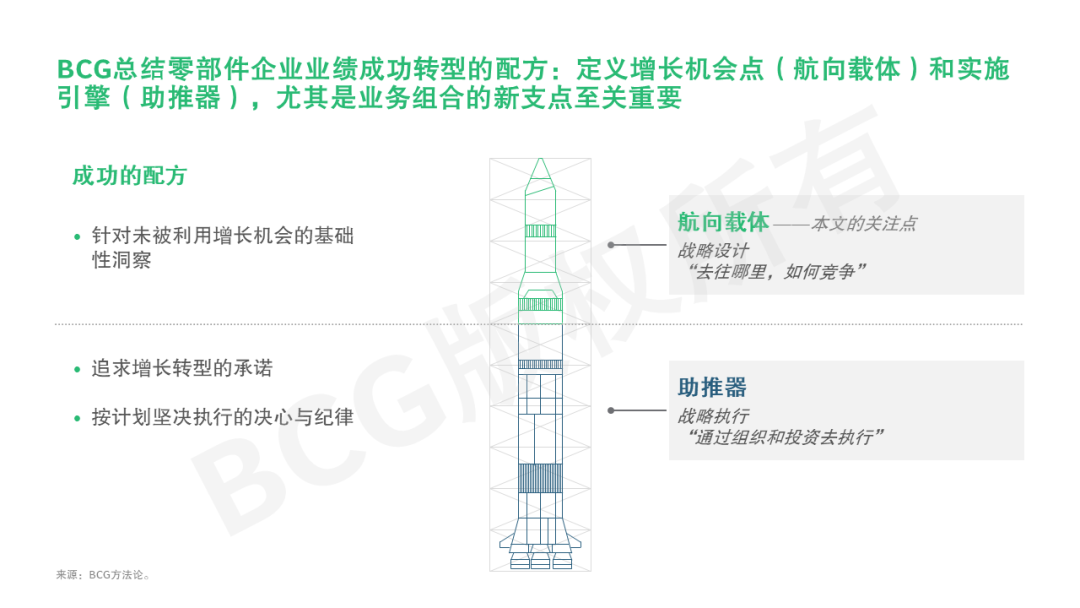 通过观察和研究大量企业在转型中的起起伏伏,BCG总结零部件企业成功转型的配方是夯实“航向载体”(即战略设计、定义增长机会点),辅以“助推器”(战略执行、实施引擎)。