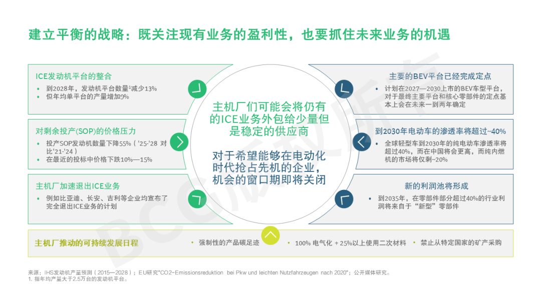 当电动化已经成为整个汽车行业公认的技术趋势和未来方向,相伴而来的智联化、自动驾驶以及共享出行将使汽车行业上下游企业在未来十年面临颠覆性的变革和重塑。在波涛汹涌的转型大潮里,不仅主机厂首当其冲,汽车零部件企业也不得不承受剧痛,从过去百年围绕着燃油机的传统业务中抽身,一边止血一边新生。因此,零部件企业当下亟需重新审视业务组合,建立契合自身企业能力的、优良的平衡战略,既要关注现有业务的盈利性,也要把握未来业务的机遇。