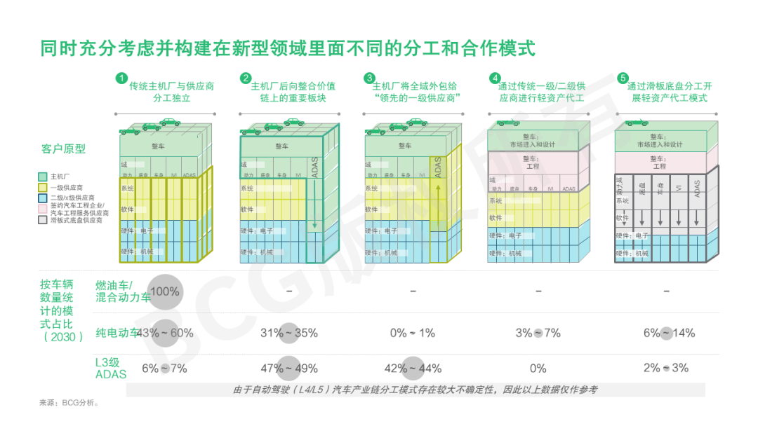 根据BCG对未来汽车供应链模式的描绘,未来零部件供应商和主机厂将出现五大类型的合作模式:
